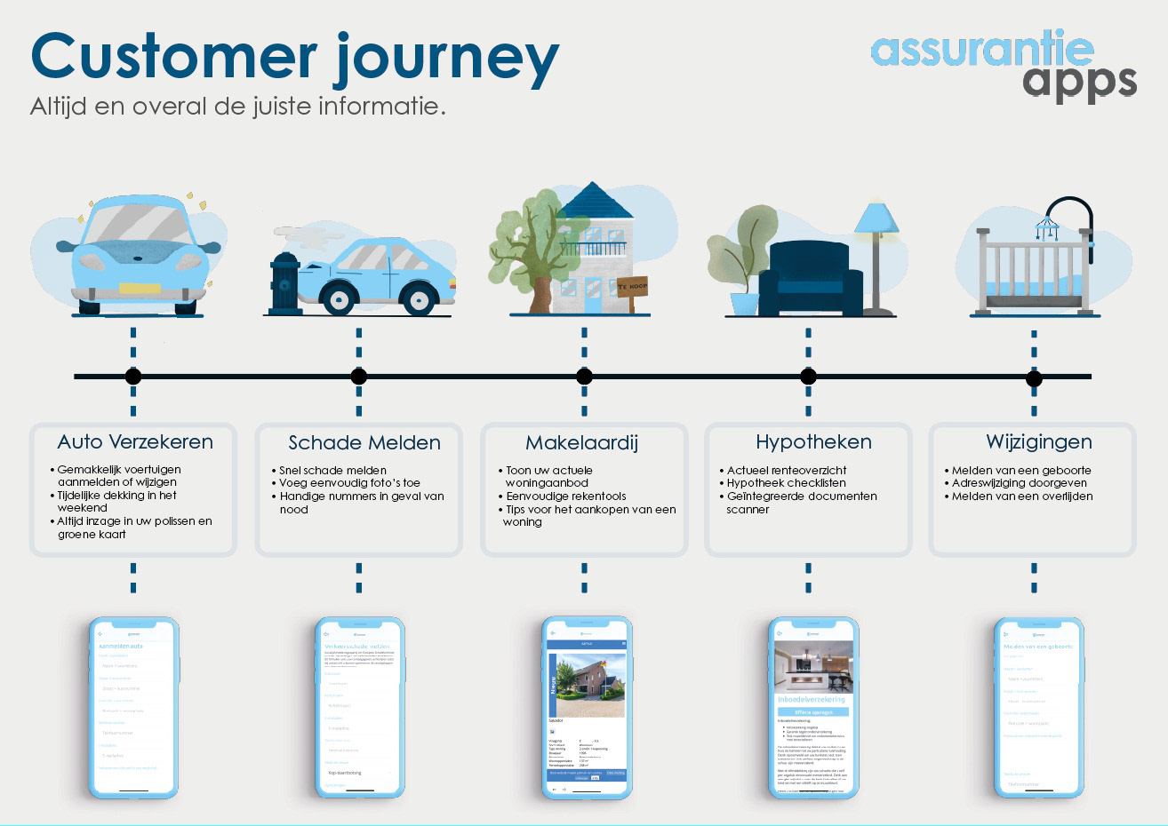 Tijdens mijn stage periode bij Concapps kreeg ik de opdracht om de voordelen van Assurantie Apps duidelijk in kaart te brengen. Dit heb ik onder andere gedaan door een customer journey te ontwerpen.